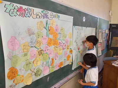 期間中に行った「なかよし読み聞かせ」や「なかよし話し合い」や道徳の授業を通して、感じたことや心に残ったこと、また、友だちに親切にされたことなどをカードに書いて模造紙に貼りました。