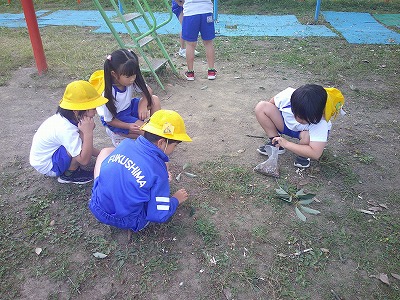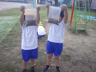 1年生の生活科の授業でどんぐり拾いをする予告をしたところ、多くの1年生が自ら休み時間に校庭でどんぐり拾いを始めています。