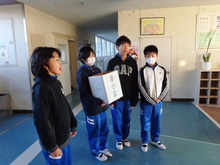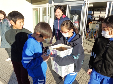児童会本部の児童が「赤い羽根共同募金」と「ユニセフ募金」への協力を呼びかけていました。
