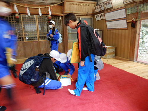 地域ボランティアから説明を受け、平日は見られない拝殿の「龍の天井画」を特別に見せてもらえました。