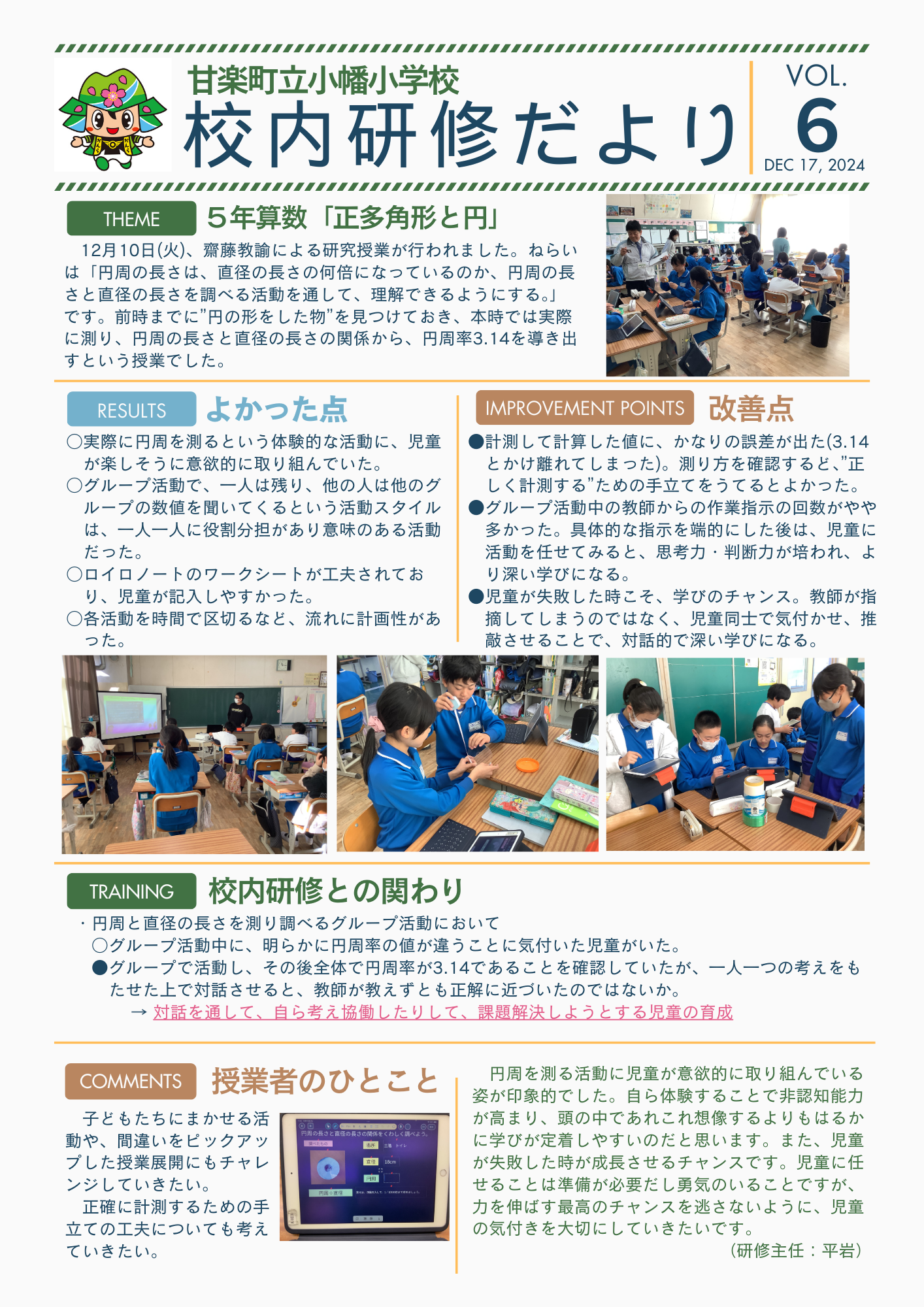 本時は、円周の長さは、直径の長さの何倍になっているのか、円周の長さと直径の長さを調べる活動を通して、理解することをめあてとしました。実際にグループに分かれていろいろなものを測ります。