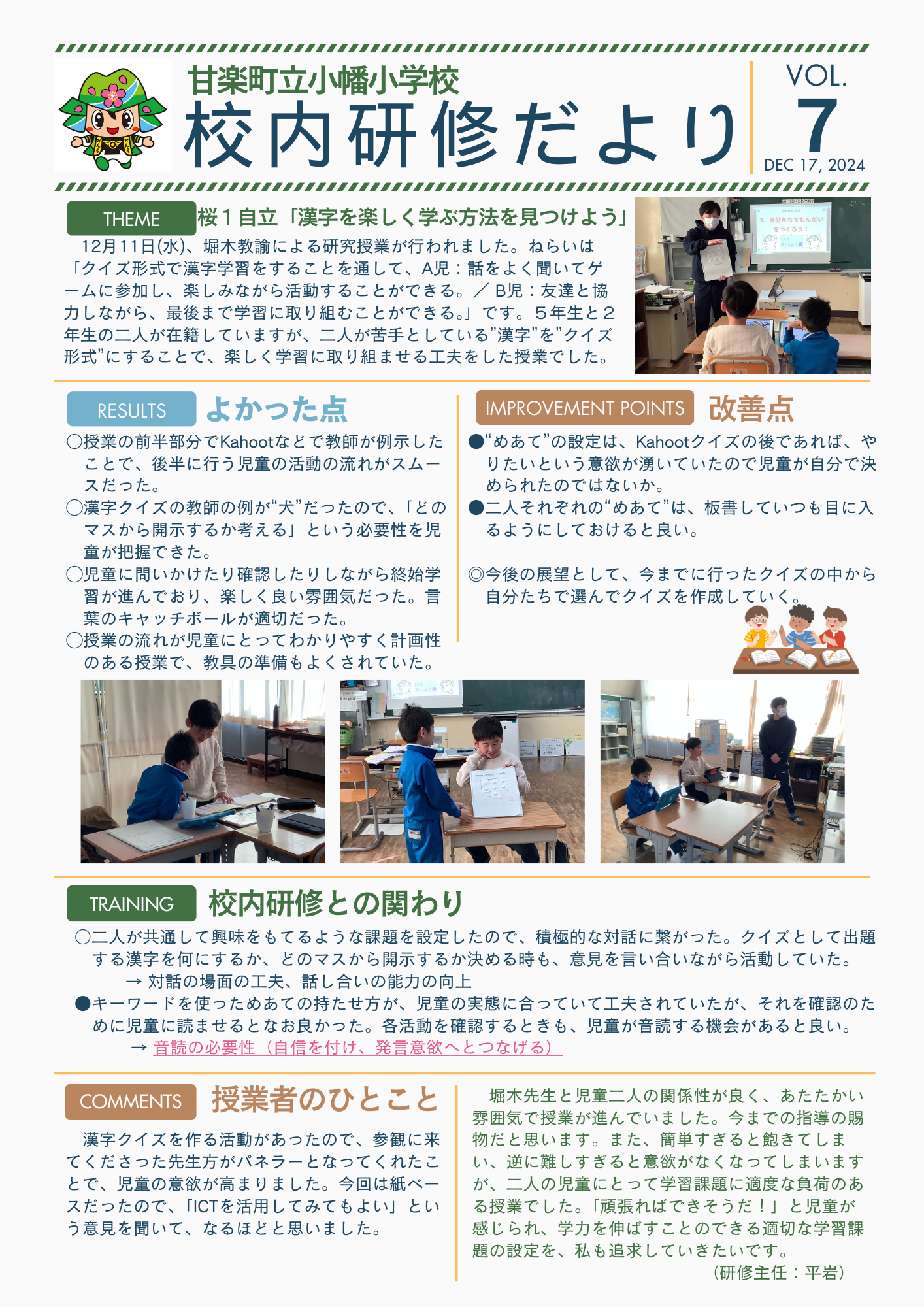 その後、学力向上コーディネーターの計画により、2名の先生が自身の学級経営で大切にしていることを発表しました。